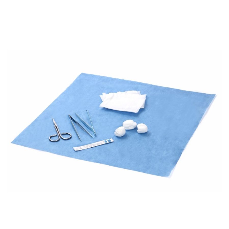 Spunlace bollar, 35g/m² spunlace, 3 st Engångsförbandstång, metall, spetsig spets, 12cm, 1 st Vävnadstång, metall, 12cm, 1 st Spunlace pads, 14,5 x 19,35cm, vikt storlek 7,25 x 9,75cm, 4-lagers, 3 st Sax för borttagning av sutur, metall, 14cm, 1 st Bricka, 17 x 11 cm, 1 st Omslag, 40 x 40 cm, 35 g/m² SMS nonwoven, 1 st Steriliseringsindikatorkort, 1 st |